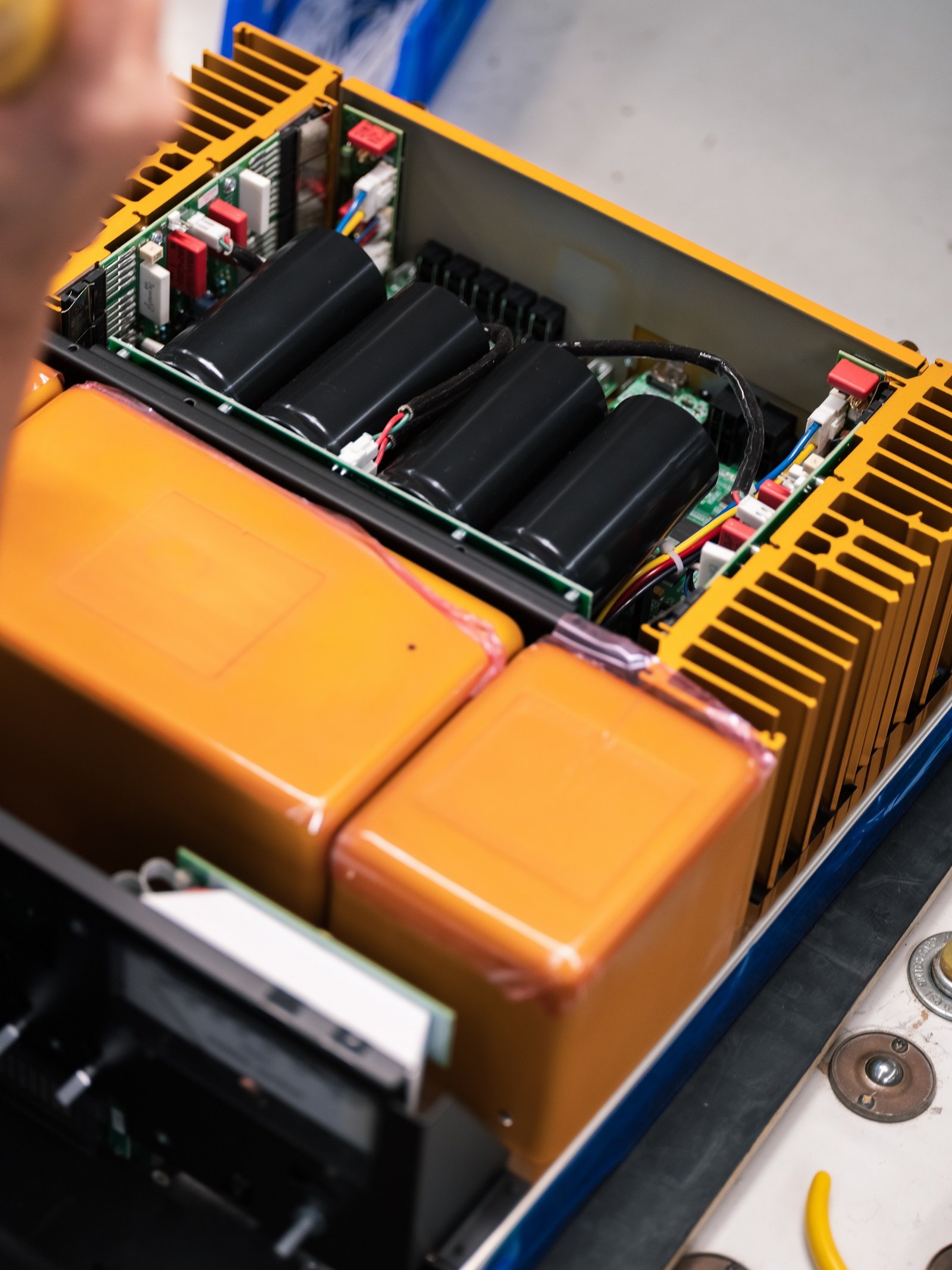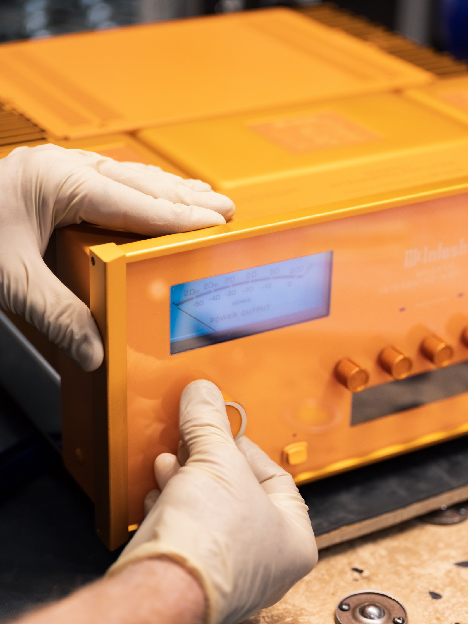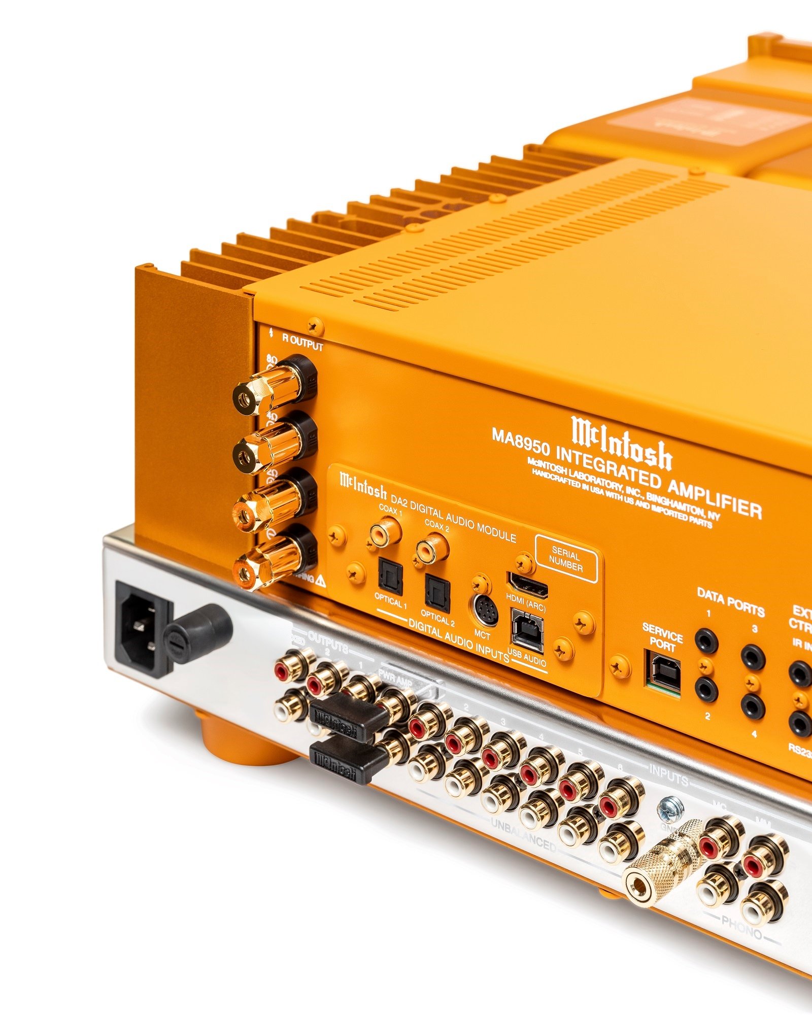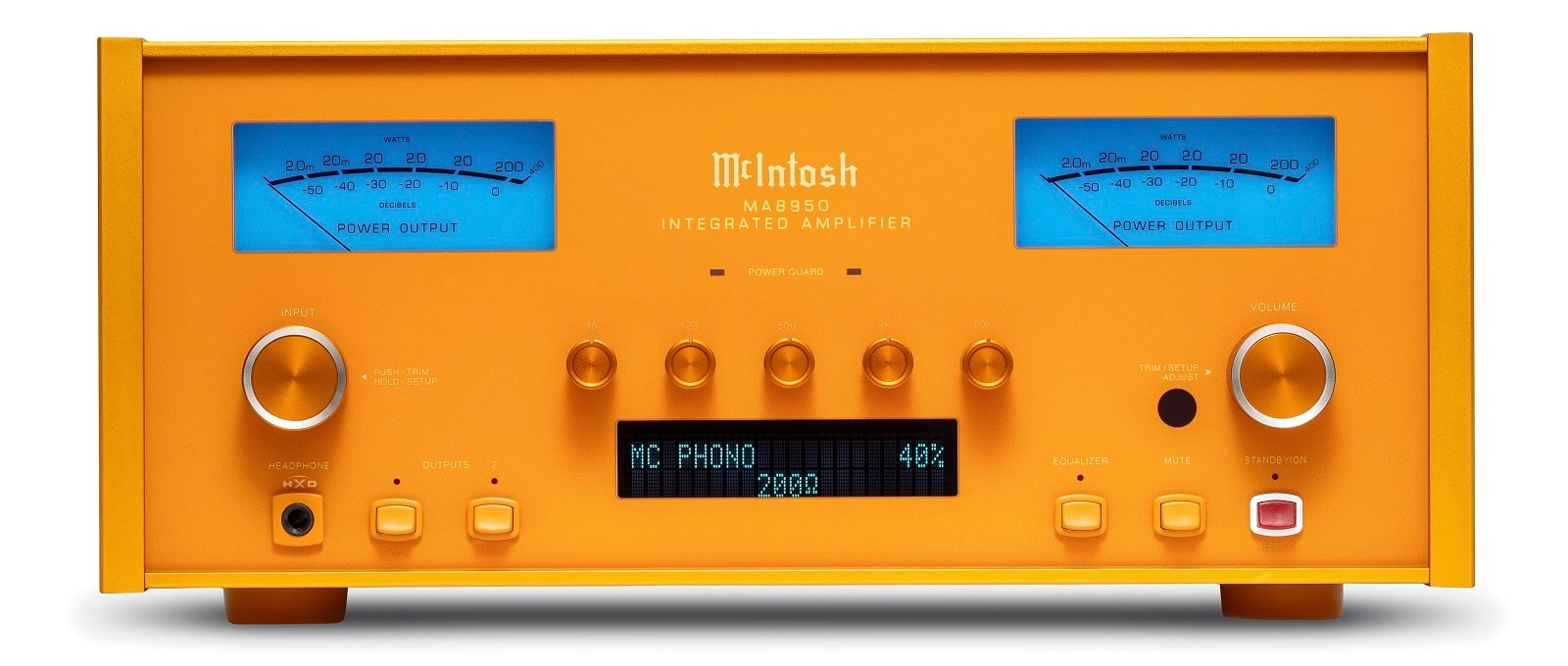 Indeed, rub your eyes and take another look. You are correct: it is a McIntosh amplifier that has had a can of orange paint poured over it. This is a significant departure from the standard black glass front and black top of the typical MA8950. The orange amplifier is one of a kind and, to our knowledge, is not available for purchase.