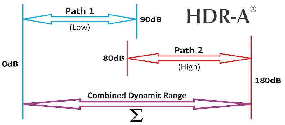 Perfecting HDR-A took over a decade of continuous research and development. The graph shows how it works. Path 1 is an audio signal with a 90 dB dynamic range, from 0 dB to 90 dB. Path 2 is an audio signal with a 100 dB dynamic range, from 80 dB to 180 dB. When paths 1 and 2 are combined, the resulting dynamic range is 180 dB, from 0 dB to 180 dB. This is multi-path audio with a high dynamic range.