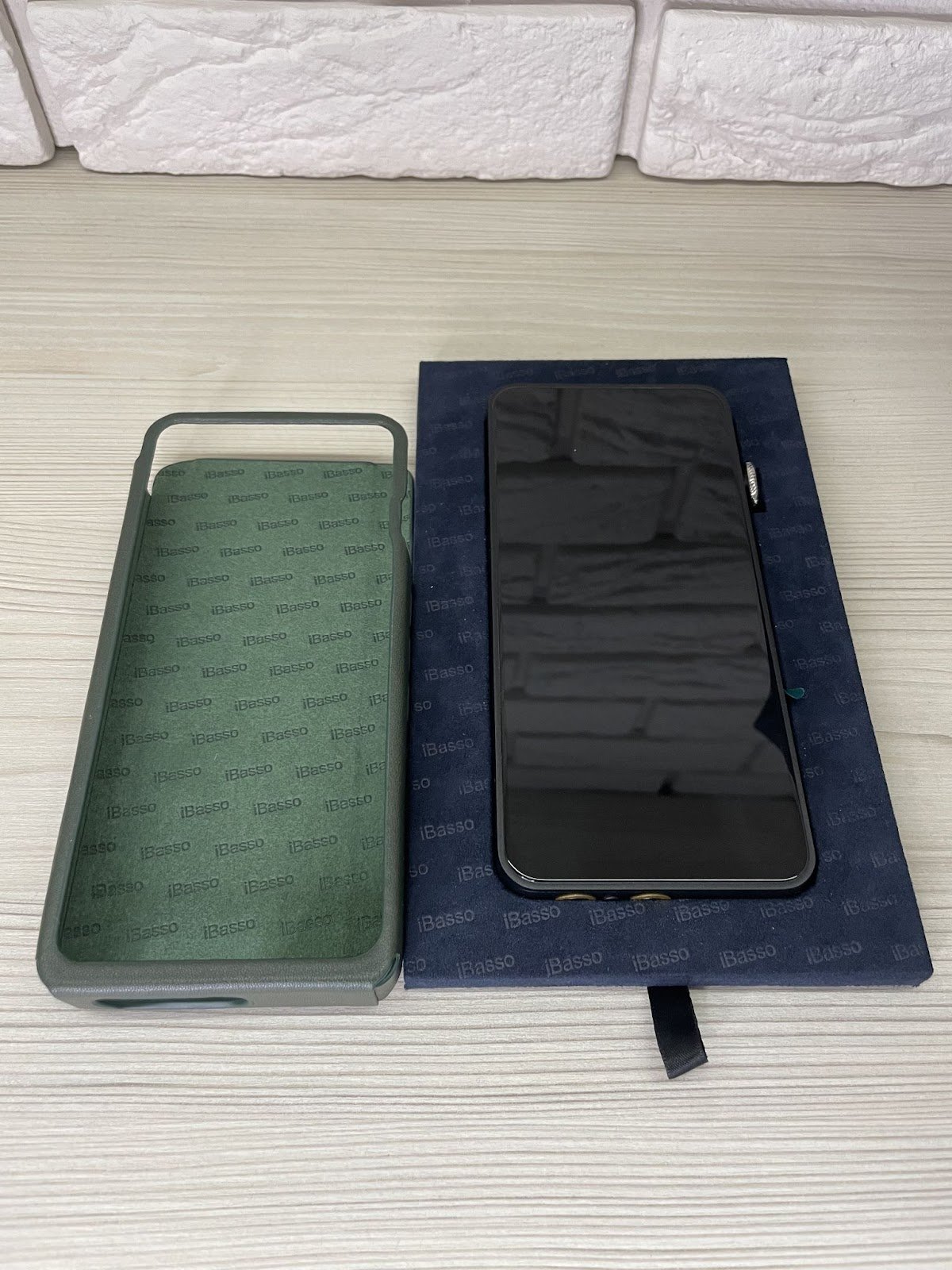 We are presented with a sleek, elongated box adorned with a gray sleeve. The front prominently displays the model along with the designation “Reference Digital Audio Player,” while the back bears the inspiring slogan “In pursuit of perfection.” Peeling away this modest cardboard exterior reveals the core packaging: a sophisticated dark blue box, unadorned save for the company's name and emblem. The anticipation builds as one lifts the lid, an action that feels uniquely ceremonial, unveiling the product in an inviting manner. The interior is meticulously lined with foam rubber, ensuring the utmost protection for every component within. The player itself rests on a plush surface, elegantly embossed with numerous “iBasso” logos, creating a visually appealing presentation.