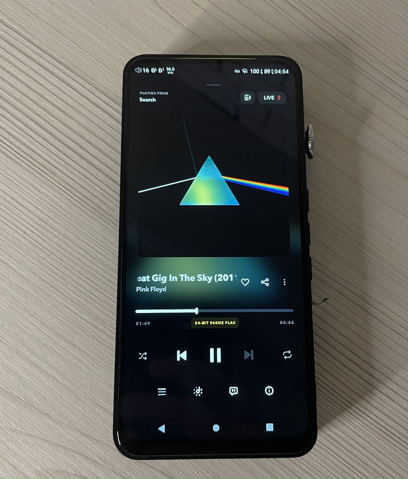 Additionally, the screen features an elegantly designed indicator bar that not only blends seamlessly with the overall aesthetic but also offers functional feedback by changing colors according to the audio format being played. This innovative feature allows users to easily identify the format at a glance, with colors such as red for MQA, mint green for FLAC 44.1-48 kHz (16-24 bit), and yellow for FLAC 96 kHz (24 bit).