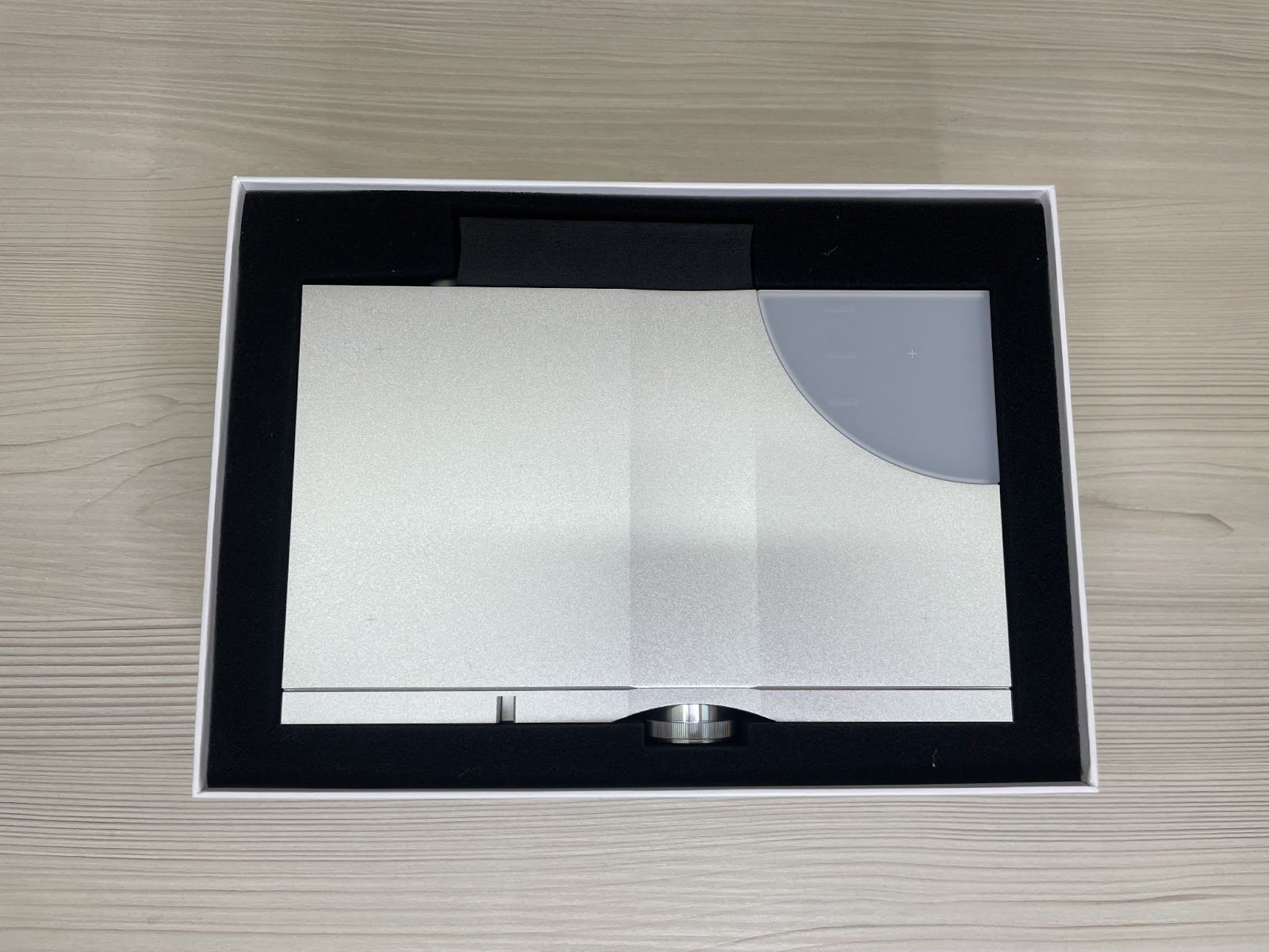 The initial aspect to highlight is the NEO iDSD 2's size. Contrary to expectations set by photographs, it presents itself as notably smaller—approximately 1.5 times less than anticipated—and impressively lightweight. Its chassis, crafted from polished aluminum, provides a tactile satisfaction. A notable design feature is the translucent window beneath which lies the Bluetooth antenna, showcasing a thoughtful level of design detail. This is further exemplified by the rubber feet, each embossed with the manufacturer's logo, indicating a commitment to both function and form.