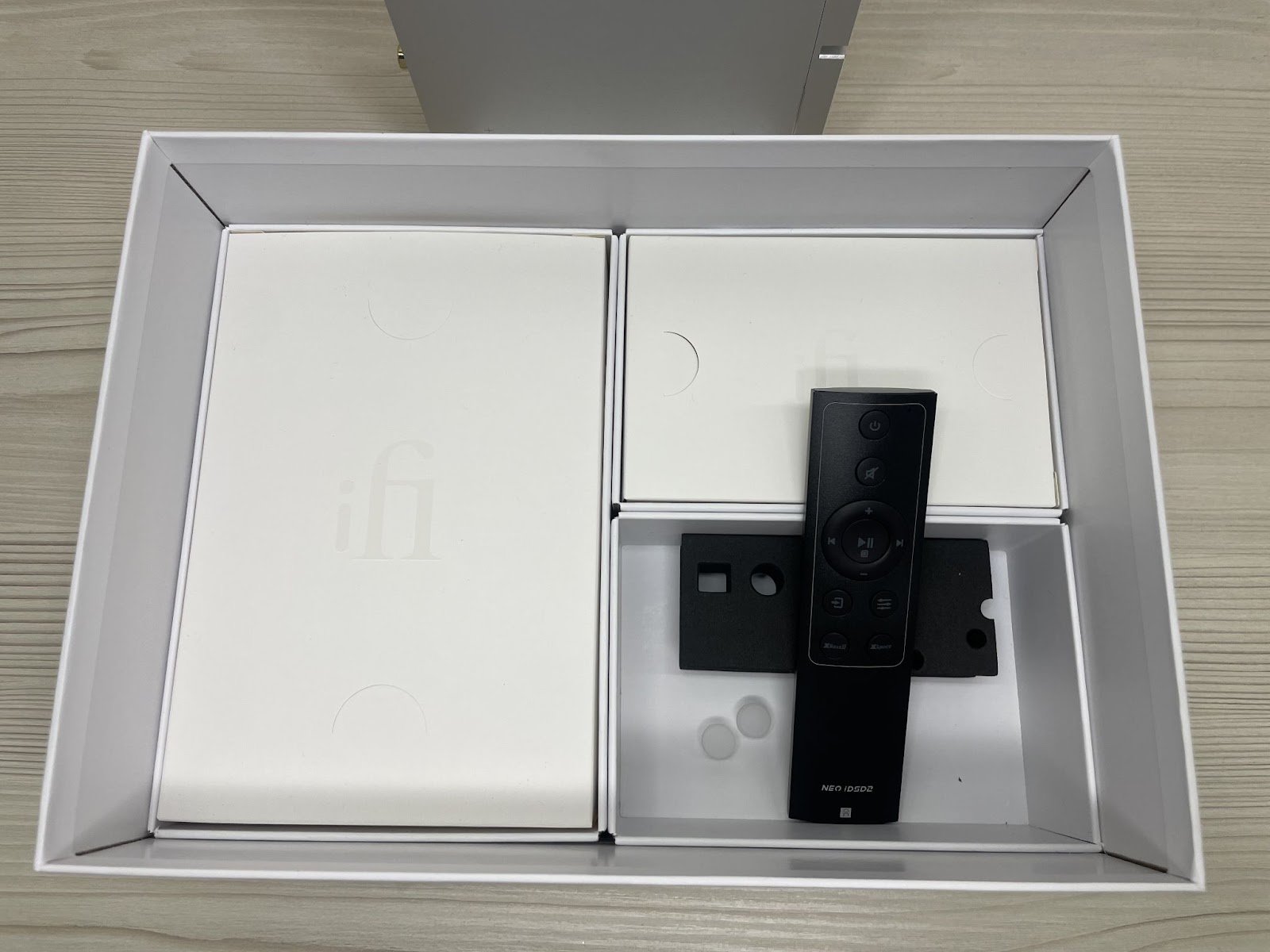 Upon unboxing the iFi NEO iDSD2, there's an immediate sense of investment in a premium product. The packaging is impressive, featuring an outer sleeve and a main box, distinctively more presentable than Shanling's approach of using plain gray cardboard boxes. Inside, the device is securely positioned alongside its corresponding accessories, indicating meticulous attention to detail and care for the unboxing experience.