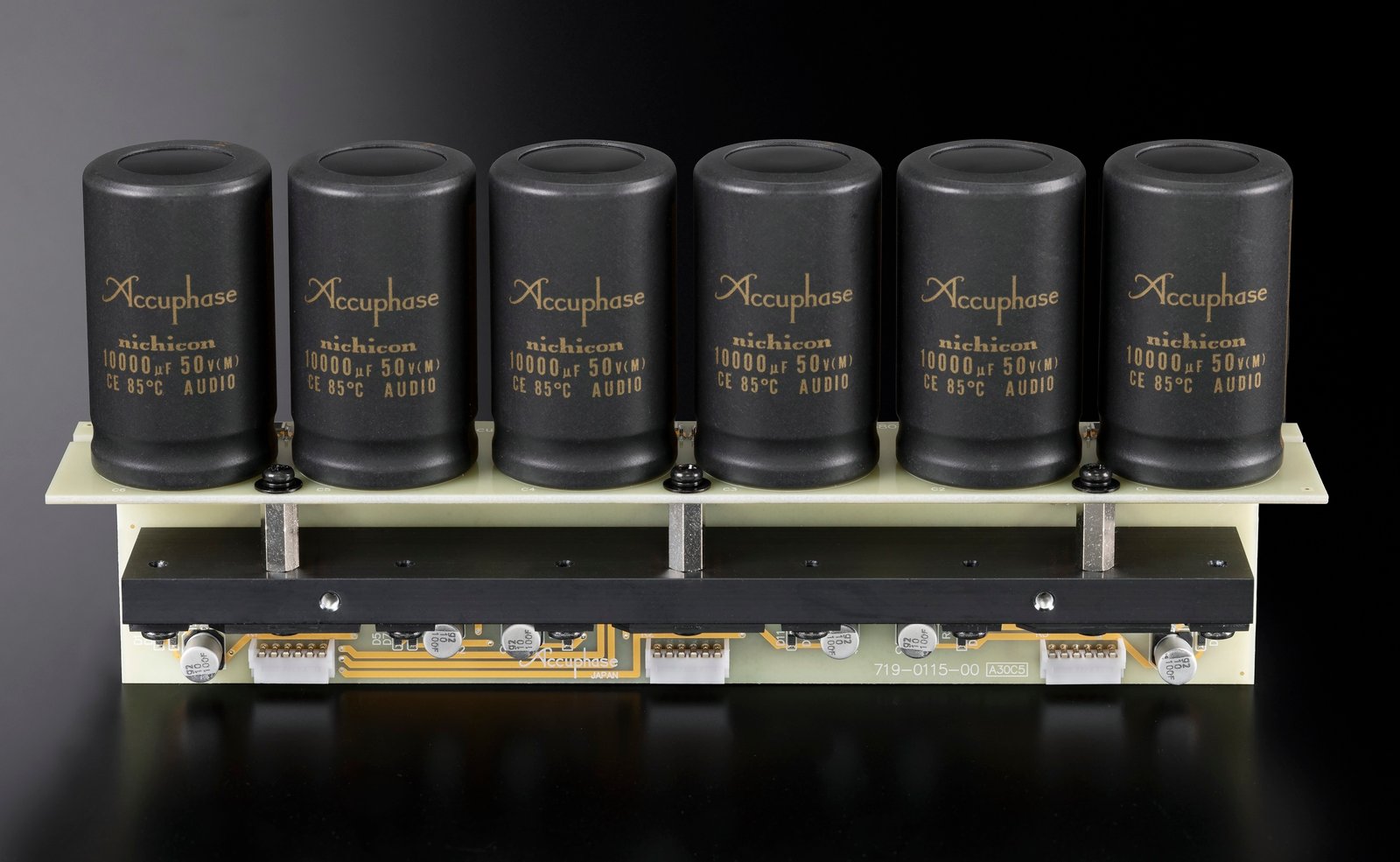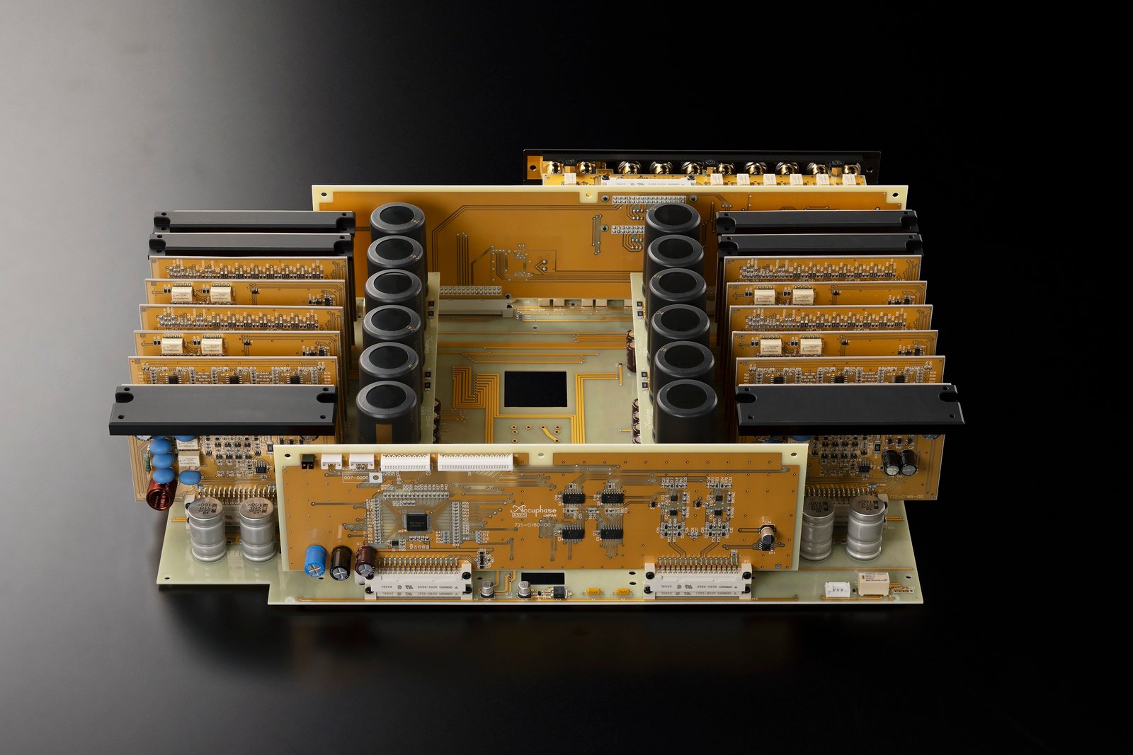 The power supply is consistently designed as a dual-mono system. Separate power supplies for the left and right channels, based on toroidal transformers, as well as a total of twelve filter capacitors, each with a capacitance of 10,000 µF, ensure stable power supply. Signal transmission takes place via printed circuit boards made of fiberglass-reinforced plastic (FRP) with fluorocarbon resin, which features a low dielectric constant.