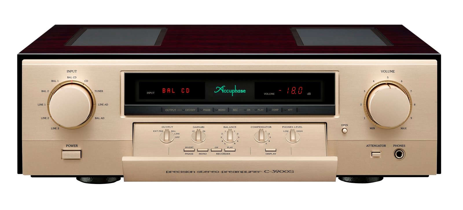 This is complemented by connections for a recording device, external preamp inputs, switchable overall gain, mono operation, a loudness function, and a switchable display. Visually, the C-3900S features a champagne-colored front panel, a solid wood cabinet, and high-quality cast iron insulating feet.