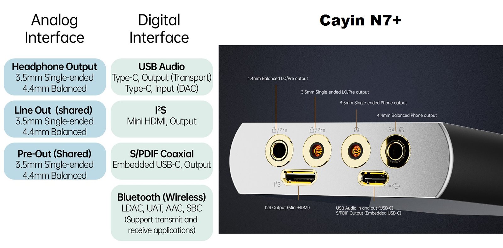 The Cayin N7+ is a portable digital music player that promises improved sound compared to any smartphone, as well as its predecessor, the N7 . To achieve this, the N7+ features a discrete digital-to-analog converter (DAC) and a fully balanced headphone amplifier with bipolar transistors that operate in either Class A or Class A/B mode. The amplifier circuit is optimized for balanced and unbalanced headphone outputs. According to the manufacturer, the discerning user will have nothing left to desire.
