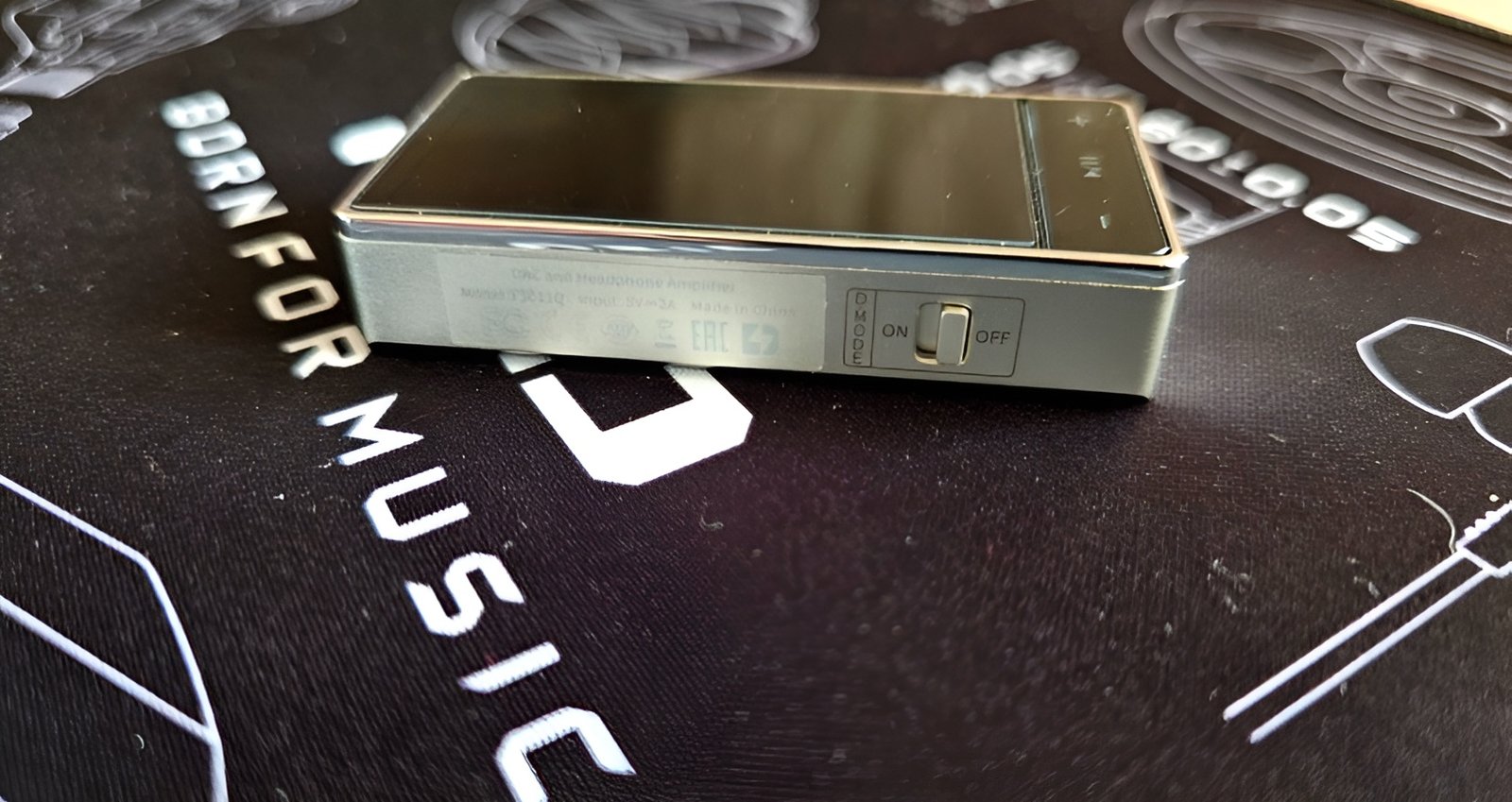 Connections are neatly laid out. On top you’ll find both 3.5 mm single-ended and 4.4 mm balanced headphone outputs. The bottom hosts the main USB-C input for your phone or computer. On the left side there’s a physical Desktop Mode switch, while the right side hides a second USB-C port for external power—marked with an orange interior so you don’t confuse it with the data port.