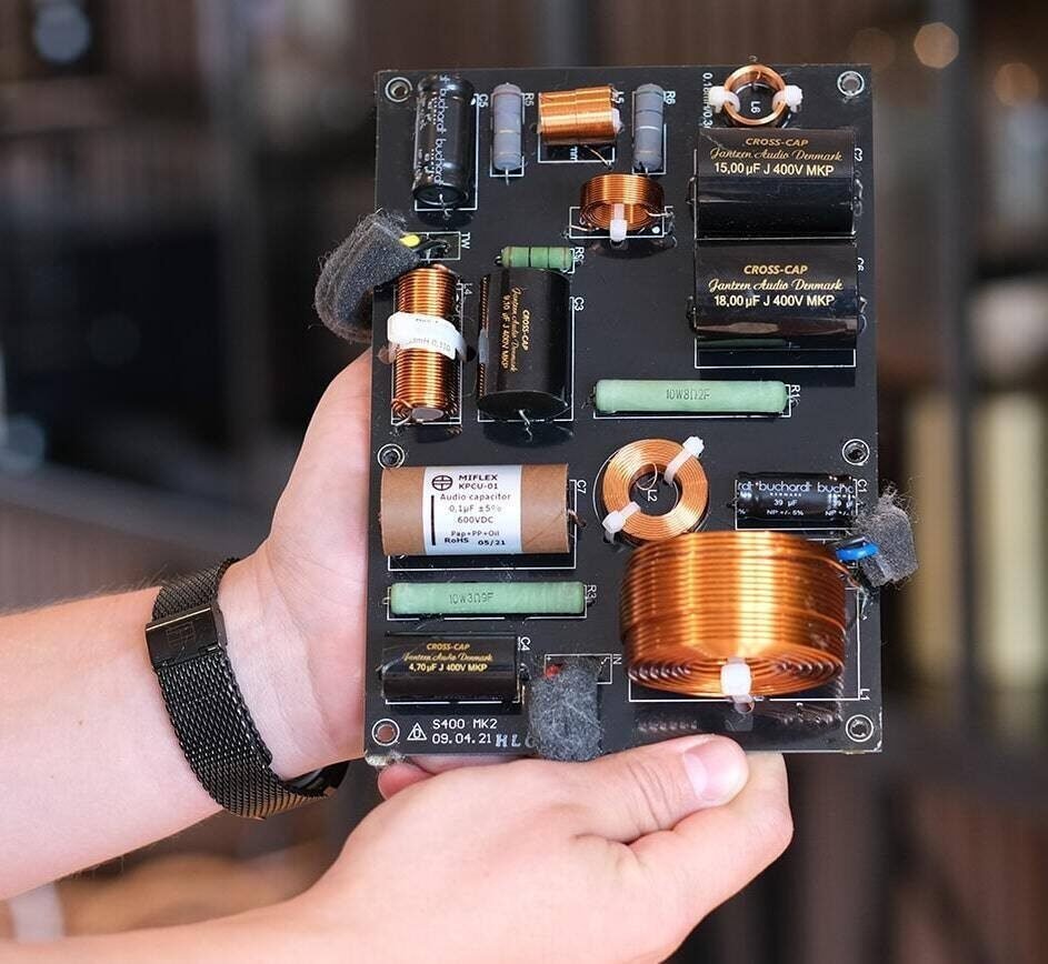 According to him, the crossover uses “carefully selected components from the reputable manufacturer Jantzen Audio Denmark.” The mentioned capacitors Crosscaps, Mox and Superres resistors, inductors wound with high purity copper wire with a thickness of 1.6 mm.