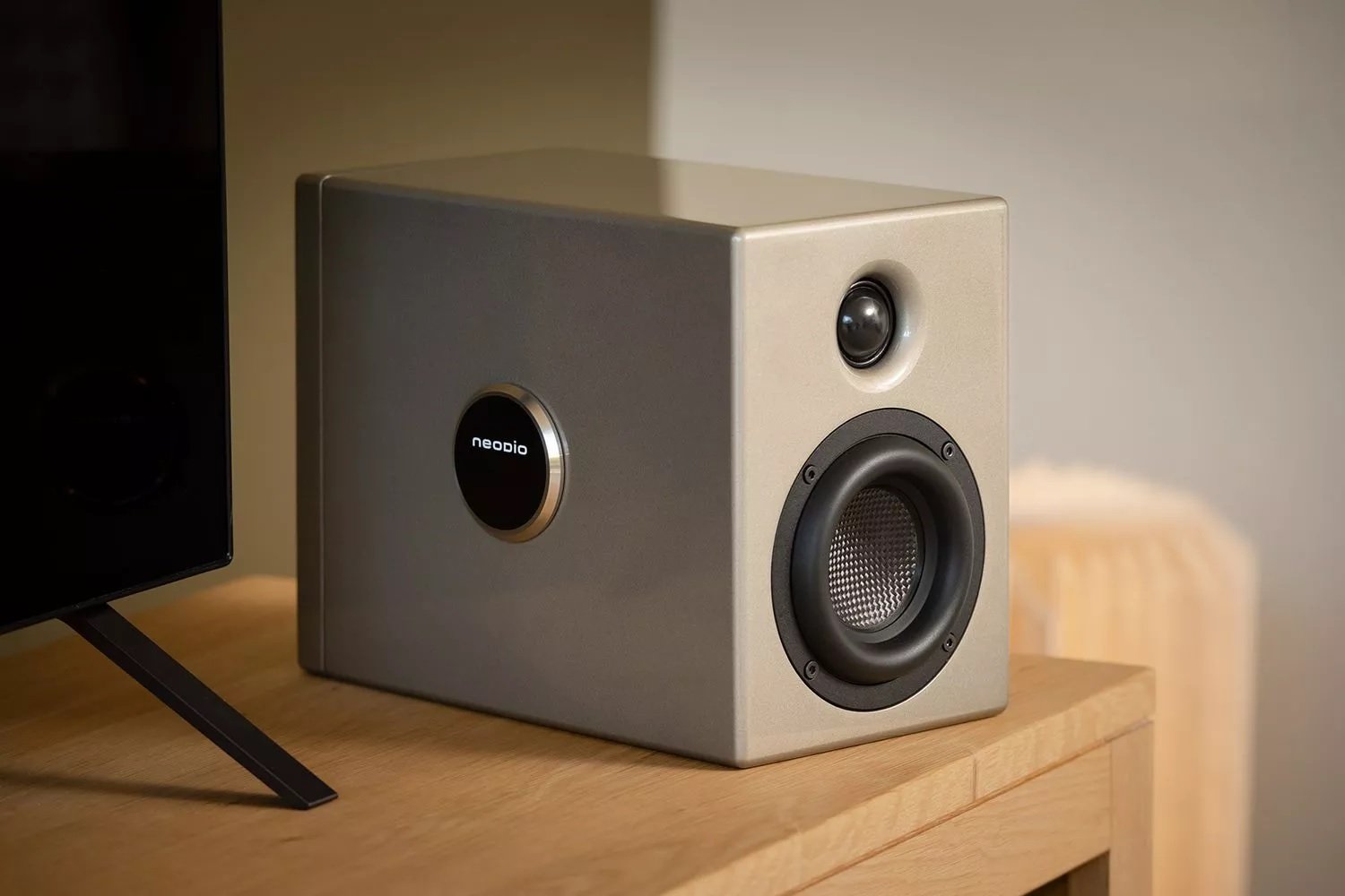 The Neodio Lilli utilizes two custom-designed drivers, manufactured in France by Kartesian. The 100mm woofer features a long-excursion, low-distortion aluminum and carbon fiber cone, while the 28mm soft-dome tweeter with a neodymium magnet is designed to reproduce high frequencies clearly and precisely. The two drivers are mounted close together in the compact enclosure, contributing to a highly coherent stereo image.