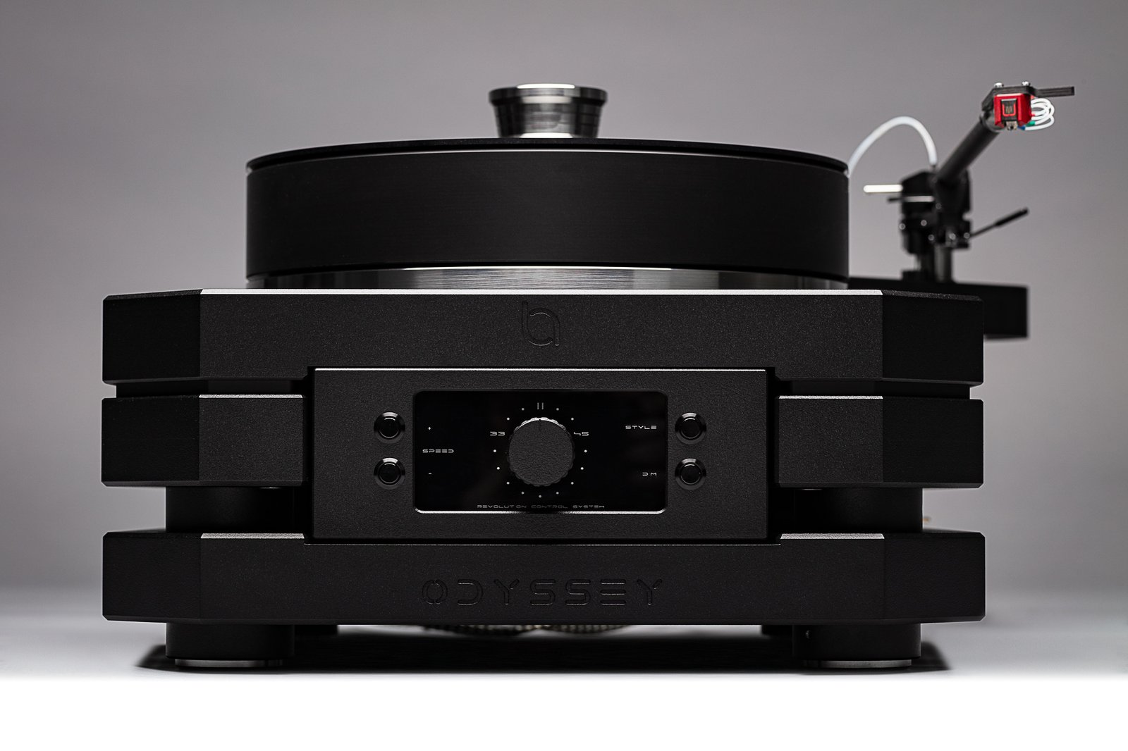 The Benny Audio Odyssey has a three-layer plinth. The turntable consists of three layers. The top layer of the upper plateau has a diameter of 300 millimeters, is made of black Delrin and weighs approximately five kilograms. The middle plateau, which also has a diameter of 300 millimeters, weighs eight kilograms and is made of steel and the bottom plateau is a disk with a diameter of 200 millimeters that weighs four kilograms. The plinth, made of sturdy aluminum and polyacetal, forms a base that would stop unwanted vibrations, with the layer of POM (polyoxymethylene) specifically intended to keep the bearing and turntable free of vibrations. The base of the Odyssey is made of aluminum base and stands on vibration-damping legs with inverted porcelain cups.