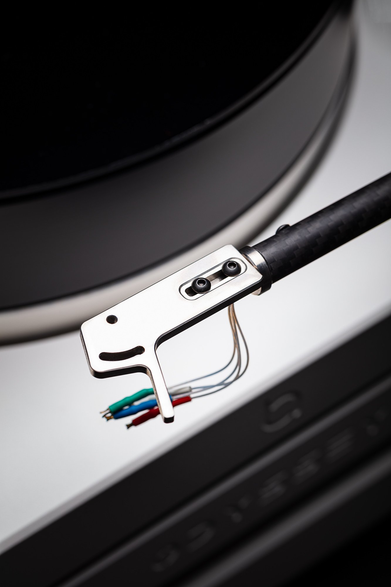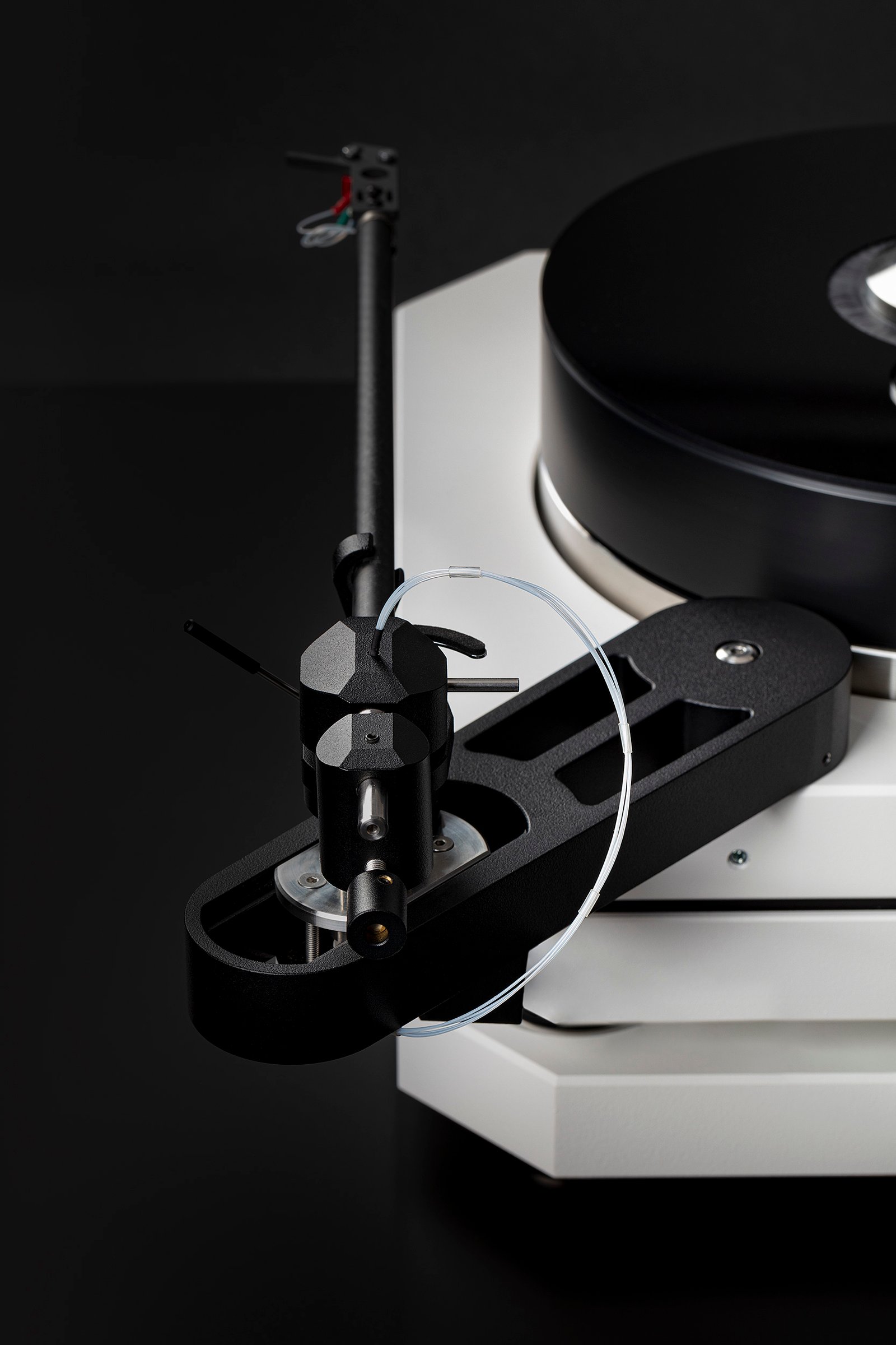 The Odyssey's long 14-inch tonearm is designed to perfectly complement the turntable. By the way, it can accommodate up to three arms (8 to 14 inches), and there are four arm mounting points on the baseboard. The 14-inch arm weighs 0.52 kg, its effective mass varies between 18 grams and 30 grams, and can accommodate carbon fiber and/or titanium cartridges and headshells. The arm features silver monocrystalline wiring directly.