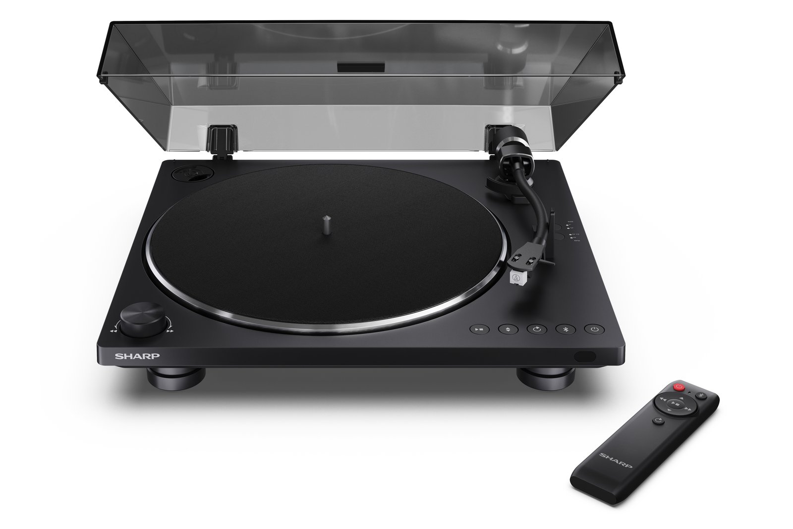 The Sharp RP-TT100 turntable features an aluminum platter, a metal tonearm, and a matte black cabinet with a tinted plexiglass dust cover. The new turntable combines classic style with modern features such as integrated Bluetooth 5.4 streaming, allowing it to connect wirelessly to compatible powered speakers or headphones.